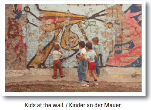 Als wir ankamen, herrschte eine positive Stimmung, ein Gefühl der Erneuerung, das ich schon lange nicht mehr in Berlin erlebt hatte. Der denkwürdigste Tag auf dieser Reise war, als unser Freund uns zur Mauer brachte. Wir beobachteten, wie ein Kran Betonplatten von der Mauer entfernte und eine Lücke öffnete, durch die wir die andere Seite sehen konnten. Unser Freund hatte einen Meißel mitgebracht, damit unser vierjähriger Sohn Stücke heraushämmern konnte, um sie als Andenken mitzunehmen. Am Nachmittag gingen wir zu einem der alten Kontrollpunkte, um zu beobachten, wie Autos und Fußgänger frei von einer Seite zur anderen passierten. Die ostdeutschen Grenzschutz Polizisten, die mir aus DDR-Zeiten einschüchternd und mit steinerner Miene in Erinnerung geblieben waren, lächelten und scherzten mit Allen. Einer von ihnen hatte sogar eines unserer Betonstücke mit einem offiziellen Grenzstempel versehen. Andere Polizisten stellten sich für Fotos mit Touristen auf.
