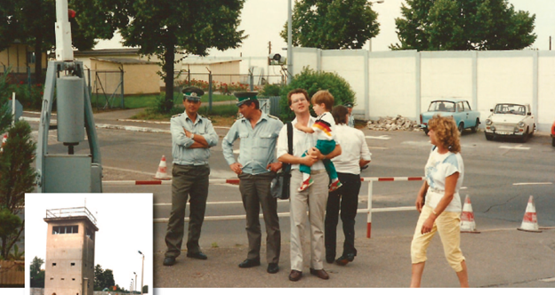 When we arrived, there was a positive vibe, a feeling of renewal that I had not seen in Berlin in a long time. The most memorable day on that trip was when our friend took us to the wall. We watched a crane remove concrete panels from the wall, opening a gap through which we could see the other side. Our friend had brought a chisel so that our son who was 4 years old could notch out pieces to keep as mementos. In the afternoon, we went to visit one of the old checkpoints to witness cars and pedestrians pass freely from one side to the other. The East German guards whom I remembered as intimidating, and stone-faced during DDR times, were suddenly smiling and joking with everyone. One of them even stamped one of our pieces of concrete with an official border crossing stamp. Other guards posed with tourists for photos.